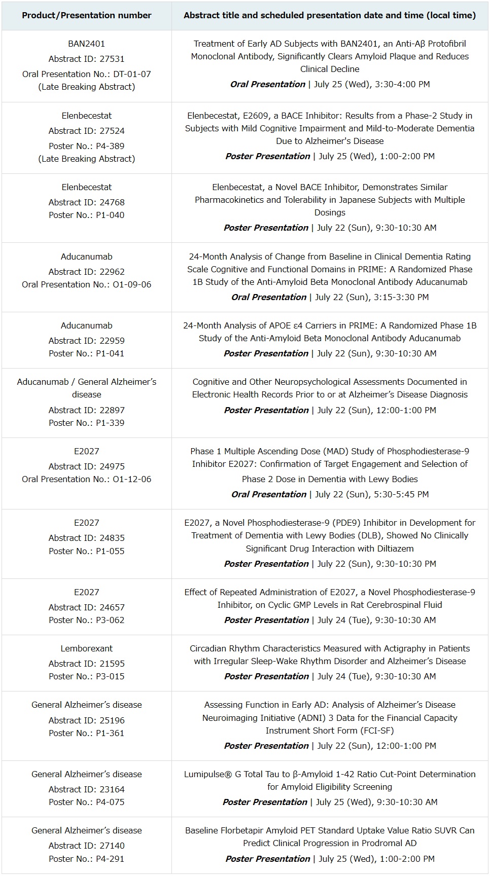 EISAI AND BIOGEN ANNOUNCE DETAILED RESULTS OF PHASE II CLINICAL STUDY OF BAN2401 IN EARLY ALZHEIMER’S DISEASE AT ALZHEIMER’S ASSOCIATION INTERNATIONAL CONFERENCE (AAIC) 2018
