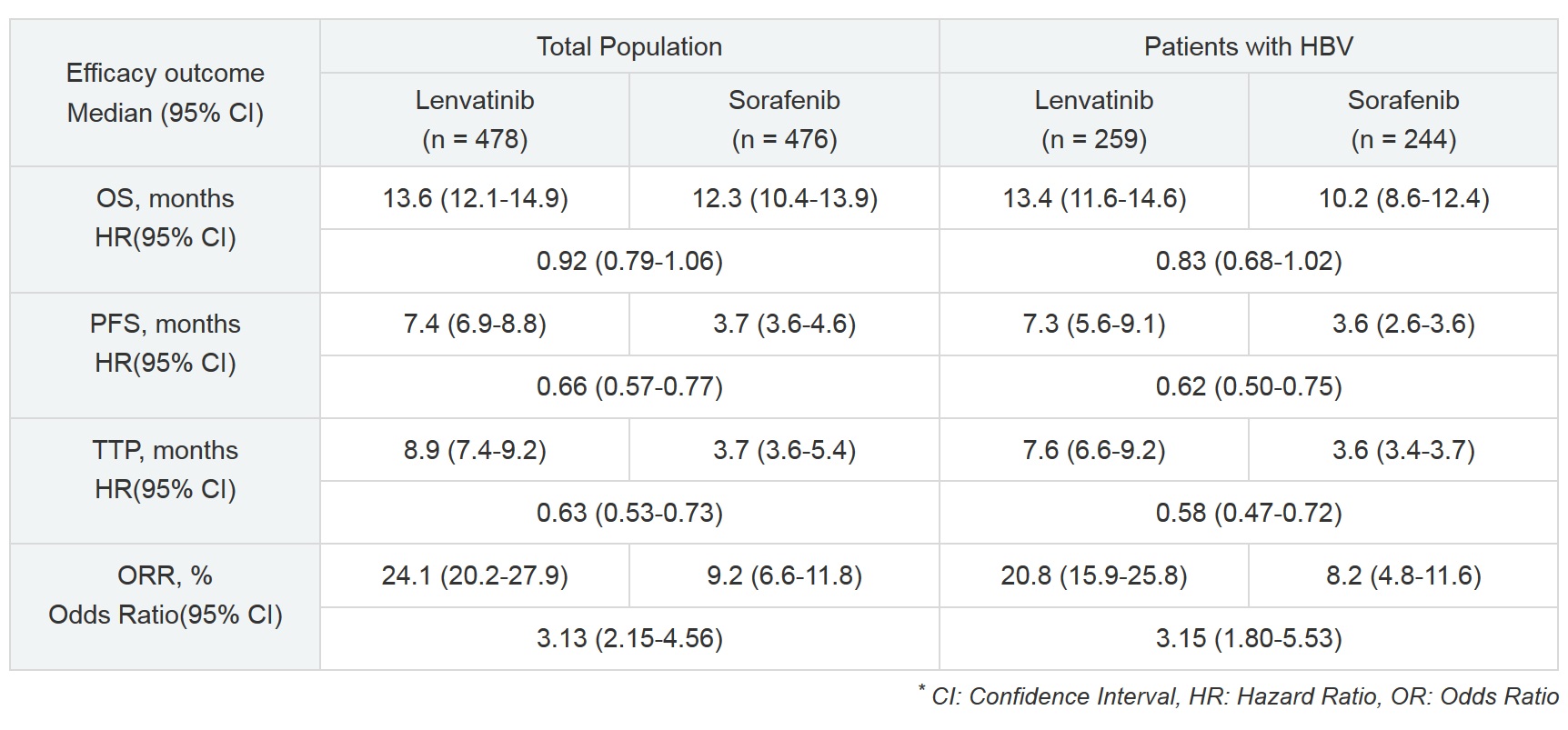 This approval was based on a Phase III clinical study (Study 304 / REFLECT study) conducted by Eisai investigating LENVIMA as a first-line treatment in patients with unresectable HCC. In this study, LENVIMA demonstrated statistically significant non-inferiority of overall survival (OS) (13.6 months) compared to sorafenib (12.3 months) (hazard ratio [HR] 0.92, 95% confidence interval [CI]=0.79-1.06). Additionally, LENVIMA showed highly statistically significant and clinically meaningful improvements as compared to sorafenib in the secondary endpoints of progression free survival (PFS) (HR 0.66, 95% CI=0.57-0.77, p<0.00001), time to progression (TTP) (HR 0.63, 95% CI=0.53-0.73, p<0.00001), and objective response rate (ORR) (LENVIMA 24% versus sorafenib 9%, p<0.00001). Furthermore, LENVIMA helped to delay deterioration in several quality of life (QOL) and symptom domains (pre-specified secondary endpoint) including in areas such as pain and diarrhea, compared to sorafenib (nominal p-value<0.05).