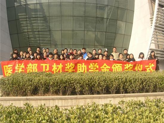 At the ensuing award ceremony, the scholarship winners come onto the stage in turn to be awarded the scholarship with smiling faces. Following that, a scholarship-winning student made a speech on behalf of all the winners. She makes the commitment to strive to become a good doctor whole-heartedly serving people. The ceremony comes to the close. All the people take photos at the entrance to the library as a memento to mark this valuable occasion.