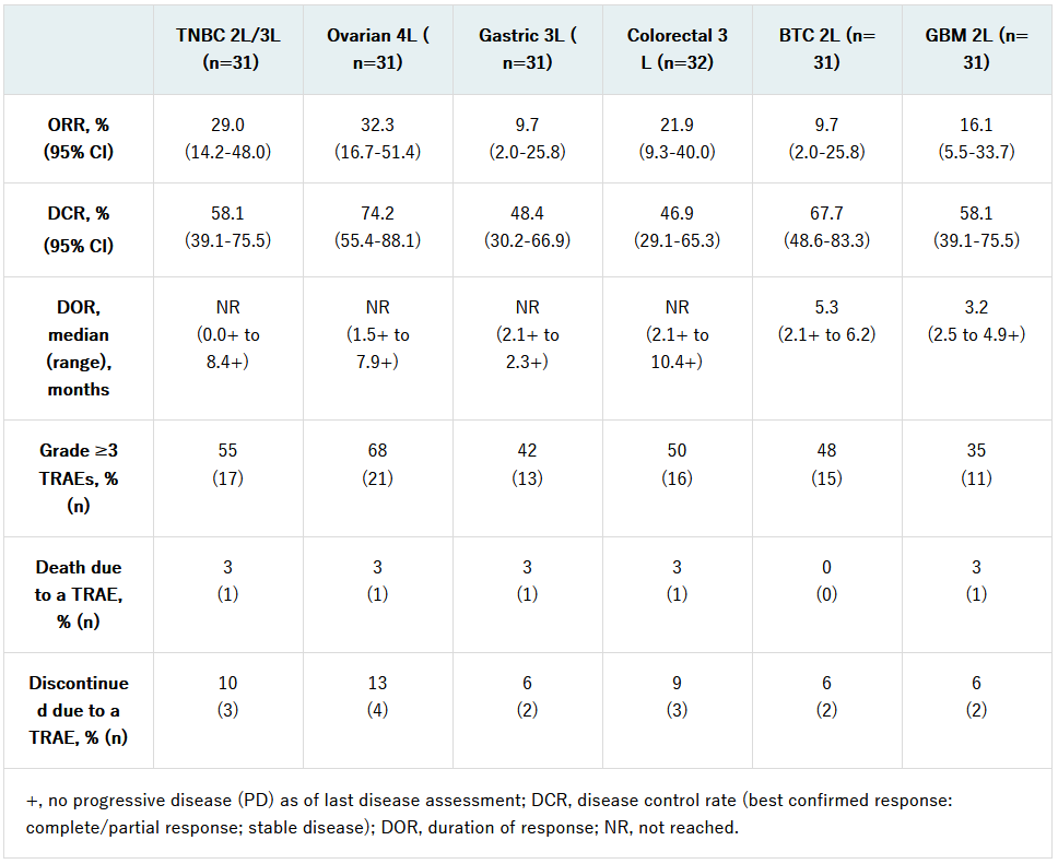 At data cutoff (April 10, 2020), a total of 187 patients were enrolled and treated. The confirmed ORR after a median duration of follow-up of 8.6 months (range: 1.9-13.1), for the six different tumor types, as well as additional efficacy and safety results, showed: